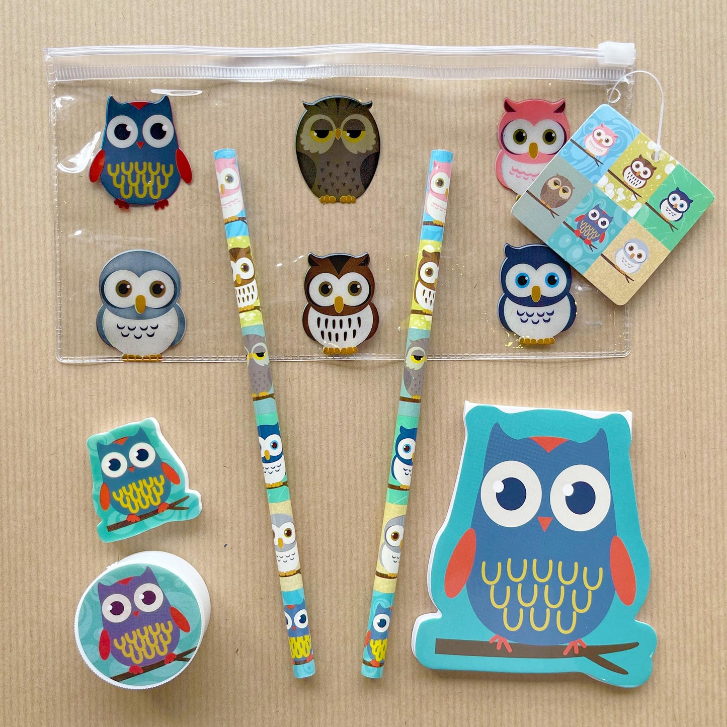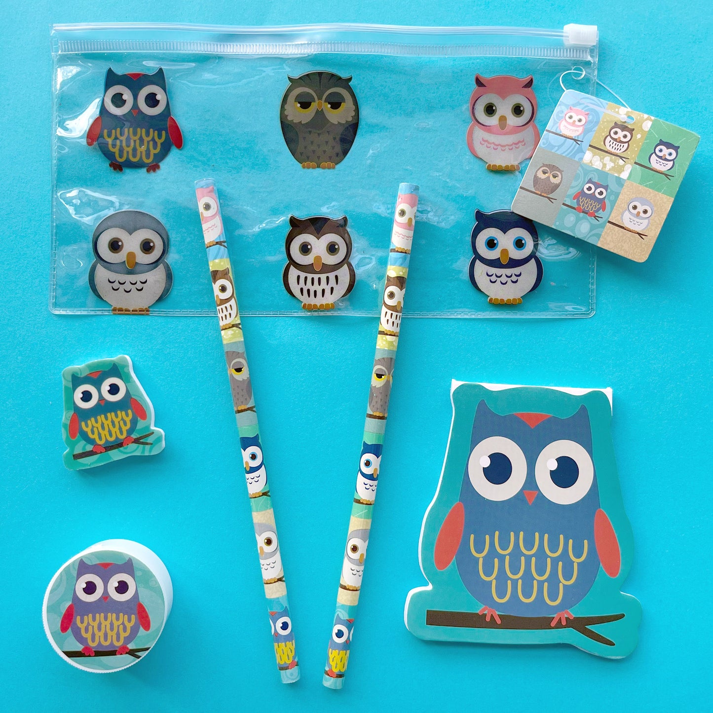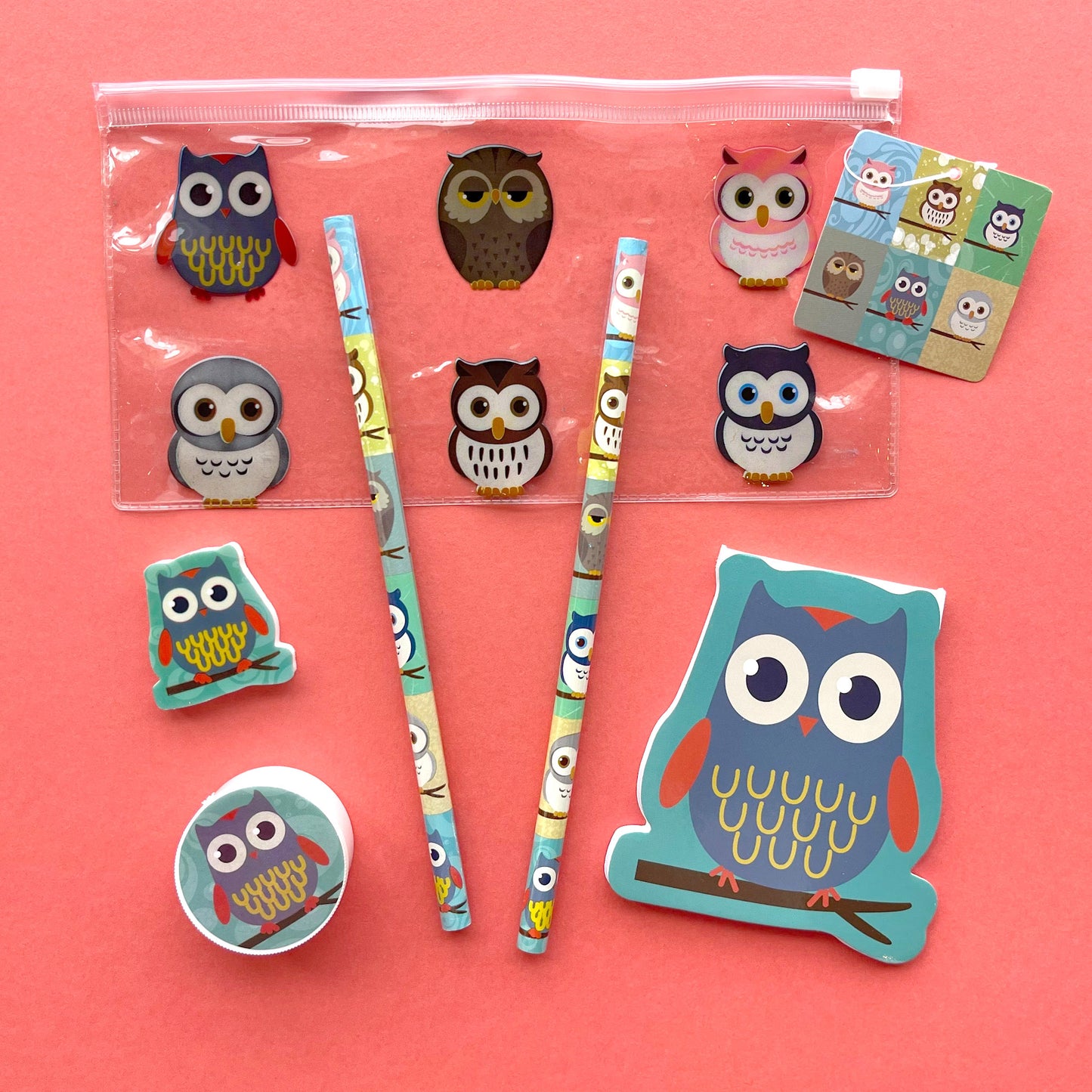This owl themed PVC pencil case is perfect for all your creative needs. It includes a memo pad, 2 pencils, sharpener, and eraser. Stay organized and inspired with this versatile and charming pencil case.