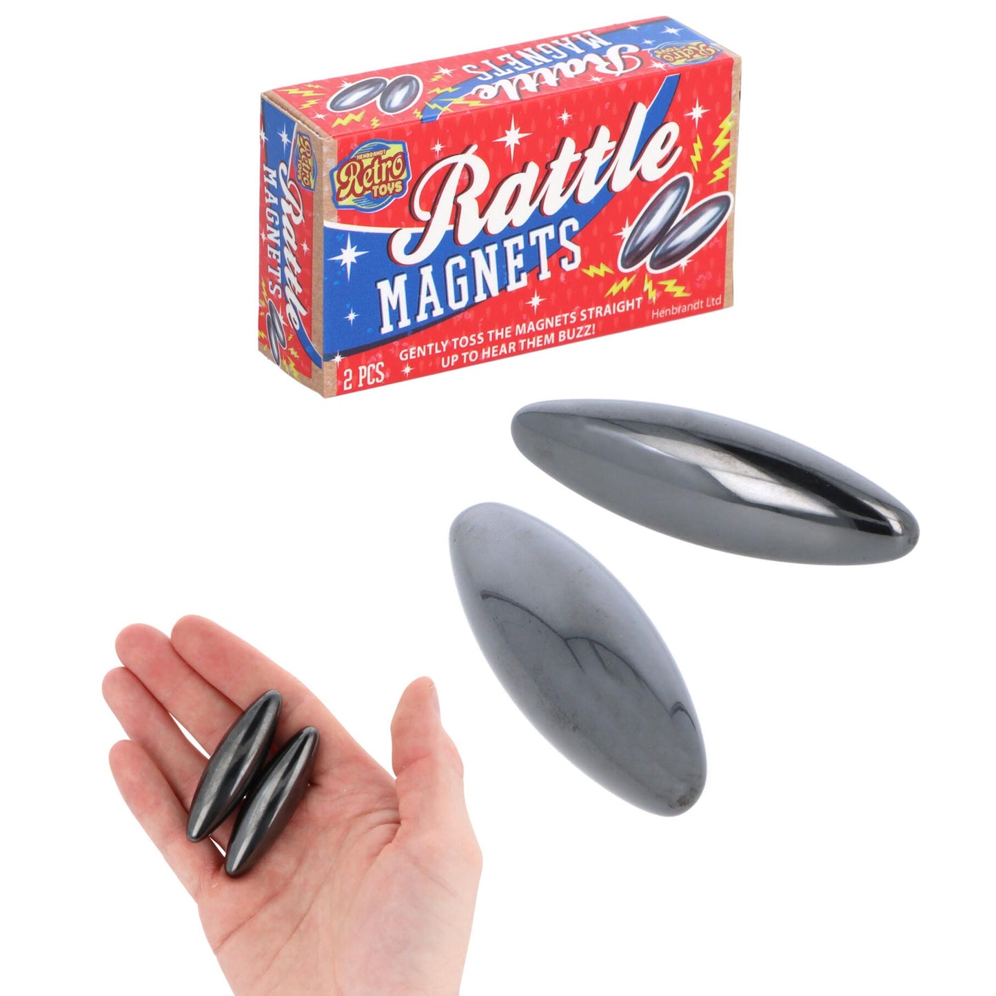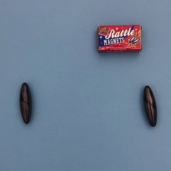 Make some noise with Rattle Magnets! This twin-pack of large oval rattle magnets is great for fidgety kids and adults alike. Toss them in the air together and they will spin through the air towards each other, creating a satisfying rattle sound.